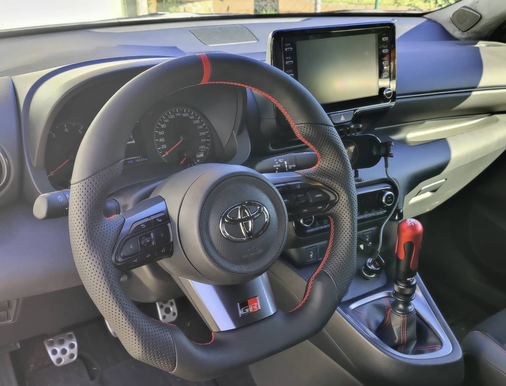Das neu entwickelte GR-Lenkrad wurde mit höchster Präzision für optimale Bedienbarkeit während der Fahrt gefertigt. In bestimmten Situationen im Motorsport ist es unerlässlich, das Lenkrad auch bei einer 180-Grad-Drehung fest im Griff zu behalten, ohne es neu greifen zu müssen. Bei herkömmlichen Lenkrädern musste man in solchen Situationen darauf achten, die Schalter nicht zu berühren, was häufig zu Beschwerden über die ungünstige Handpositionierung führte. Die daraufhin begonnene Entwicklung umfasste die Montage von Prototypen aus Ton an Fahrzeugen und deren wiederholte Erprobung auf Rennstrecken mit professionellen Rennfahrern. Das Ergebnis ist ein Lenkrad mit reduziertem Durchmesser für ein verbessertes Lenkverhalten und einer ergonomischen Form für die linke und rechte Hand, die auch bei Kurvenfahrten angenehm in der Hand liegt. Auch die am Lenkrad montierten Schalter basieren auf Erkenntnissen aus dem Motorsport: Jeder Schalter ist für eine optimale Bedienbarkeit separat positioniert und mit einem Leuchtring für bessere Sichtbarkeit bei Nacht versehen.