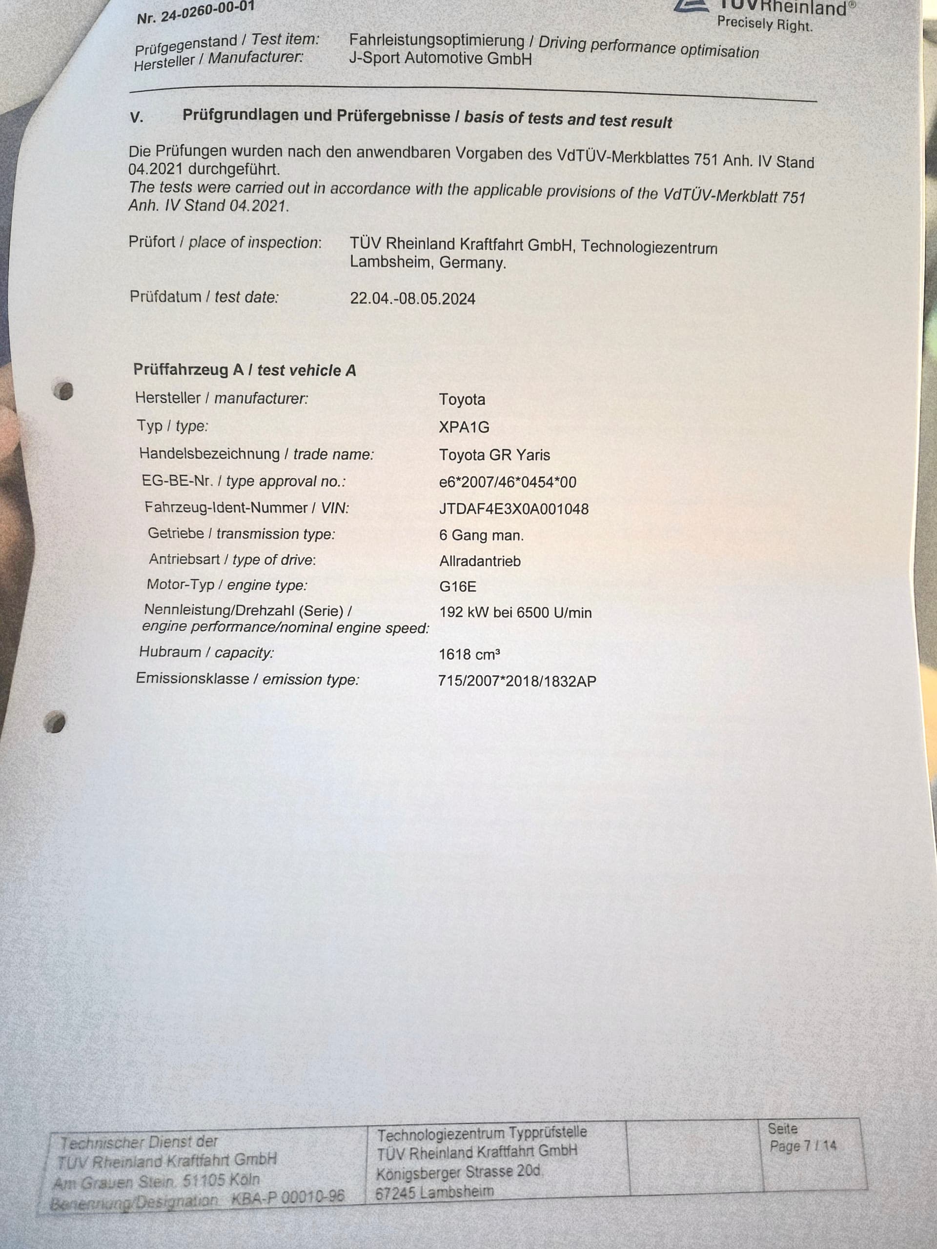 Auf Seite 7 steht die FIN des Prüffahrzeuges.