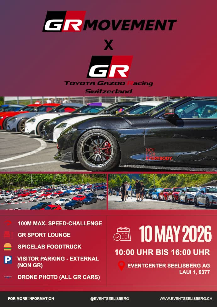 Toyota Gazoo Racing Switzerland, zusammen mit dem Drivingcenter Eventseelisberg präsentieren Euch das 2. GR Movement in der Schweiz. Wir laden alle GR86, GR Yaris, GR Supra und GR Corolla Owners zu einem exklusiven Event im Herzen der Schweiz ein. Zutritt auf das Gelände haben nur die genannten vier Fahrzeugmodelle mit Ihren Insassen/innen, alle weiteren Besucher/innen werden zum externen Parking in der Steckenmattstrasse in Seelisberg weitergeleitet.