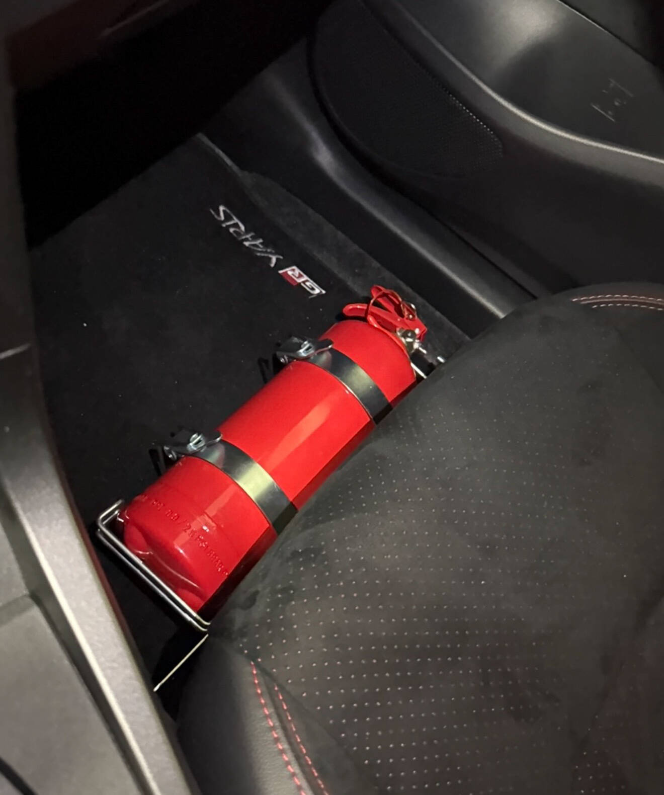 Um an der GLP teilnehmen zu dürfen, brauchen wir einen fest verbauten Feuerlöscher. Den haben wir am Beifahrersitz mit einer selbstgebauten Halterung befestigt. Sie ist noch nicht final fertig, sieht aber schon gut aus. Die Halterung wird noch in mattschwarz lackiert.