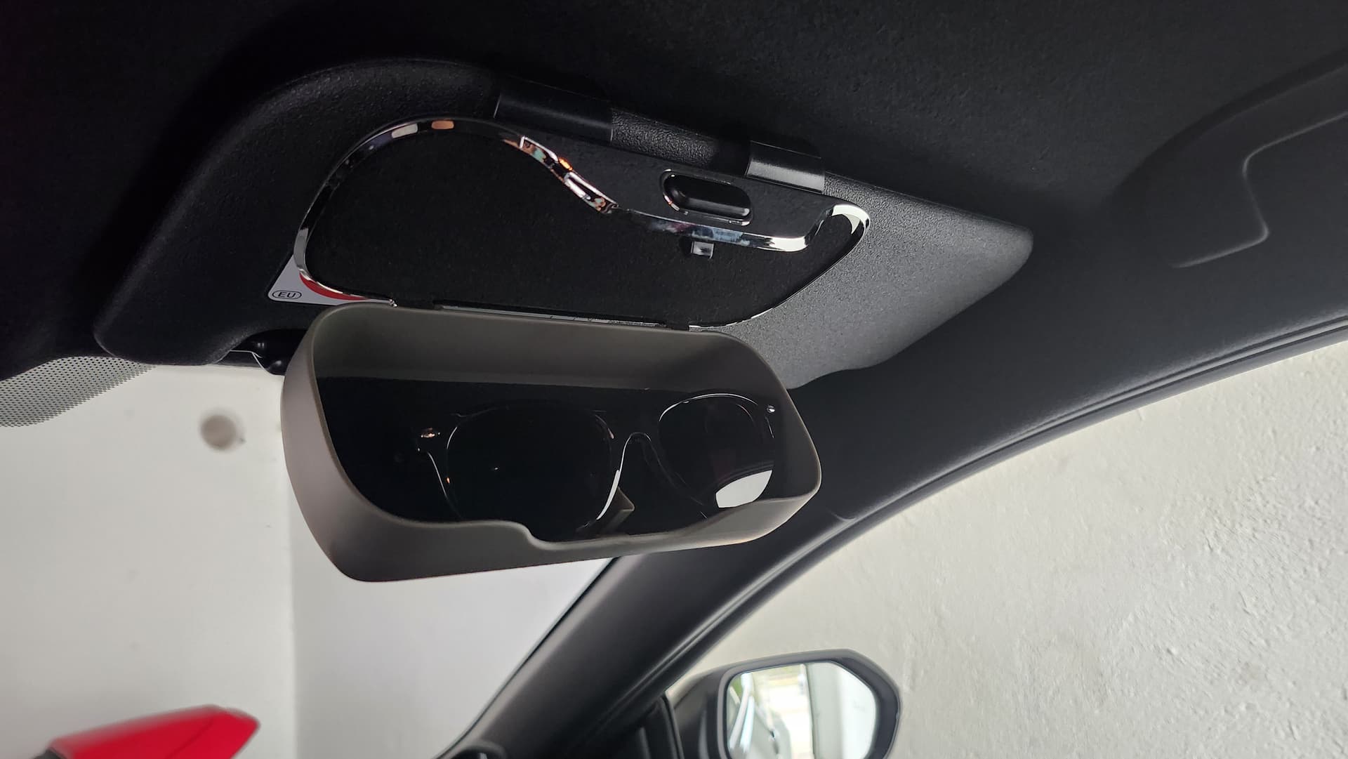 Da ich ebenfalls das Problem des Verstauens meiner Sonnenbrille habe, ging das für 10 € auch noch mit, auch für größere Brillen geeignet, wird nur eingehakt, sitzt aber fest: