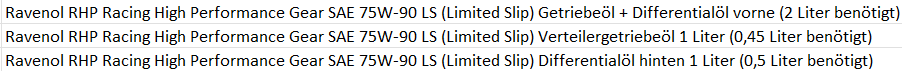 @SilentShine ich nutze im Getriebe, dem Verteilergetriebe & Differenzial hinten (Frontdifferenzial ist im Getriebe mit drin), dass Ravenol RHP Racing High Performance Gear SAE 75W-90.