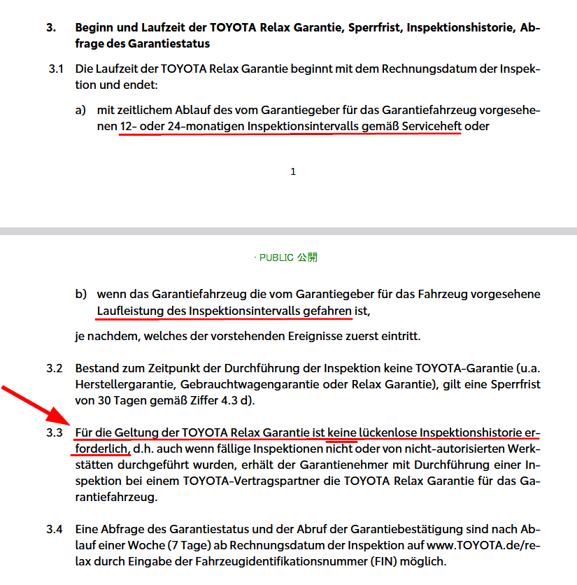 So ist auch mein Verständnis zur Relax-Garantie. Ggf. gibt es bei der zusätzlichen Neuwagen-Garantie und/oder der gesetzlich sowieso geltenden Gewährleistung wieder andere Punkte zu beachten. Nachtrag: in den Relax-Garantiebedingungen steht übrigens „12 Monate“ als Intervall drin…auch für den GR Yaris (s.o.).