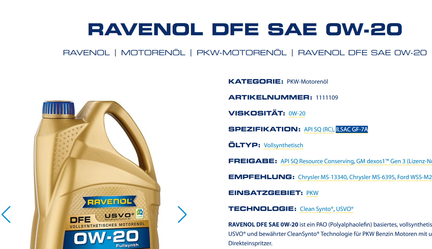 Mir ist übrigens aufgefallen dass das 0W20 von Ravenol eine LSPI 7 Spezifikation besitzt und somit das Original Toyota Öl übertrifft.