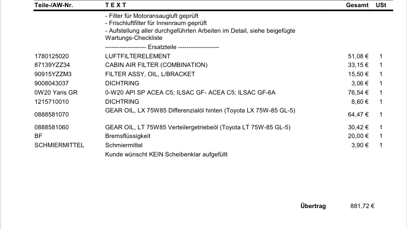 Cool finde ich bei dem Preis gerade, dass ein Austausch mehrerer Komponenten ohne Beratung dazu einfach auf den Kostenvoranschlag gesetzt wurden (Innenraumluftfilter, Luftfilter, Diff-Öl usw.), aber seht selbst….