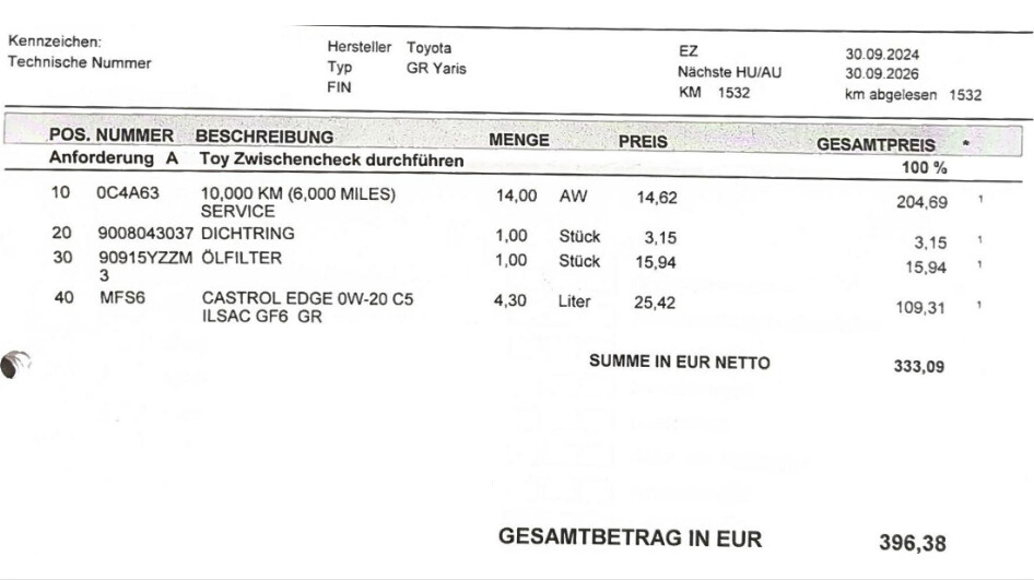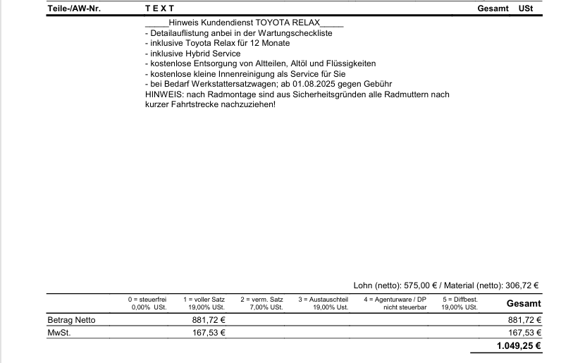 Servus zusammen, einmal ein Ausschnitt vom Kostenvoranschlag für die Inspektion nach 2 Jahren und ca. 10500km.