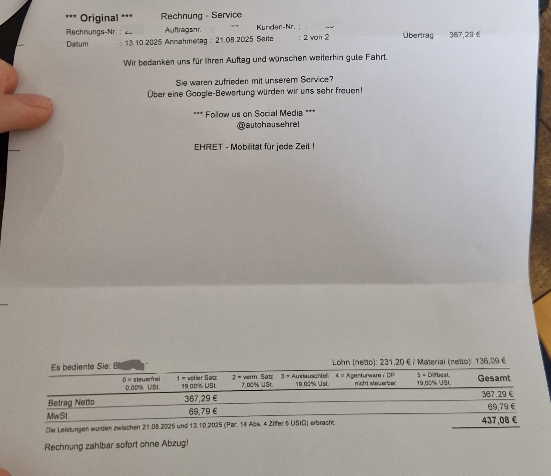 Genauso auf dem Zettel am Luftfilterkasten und auf der Rechnung.