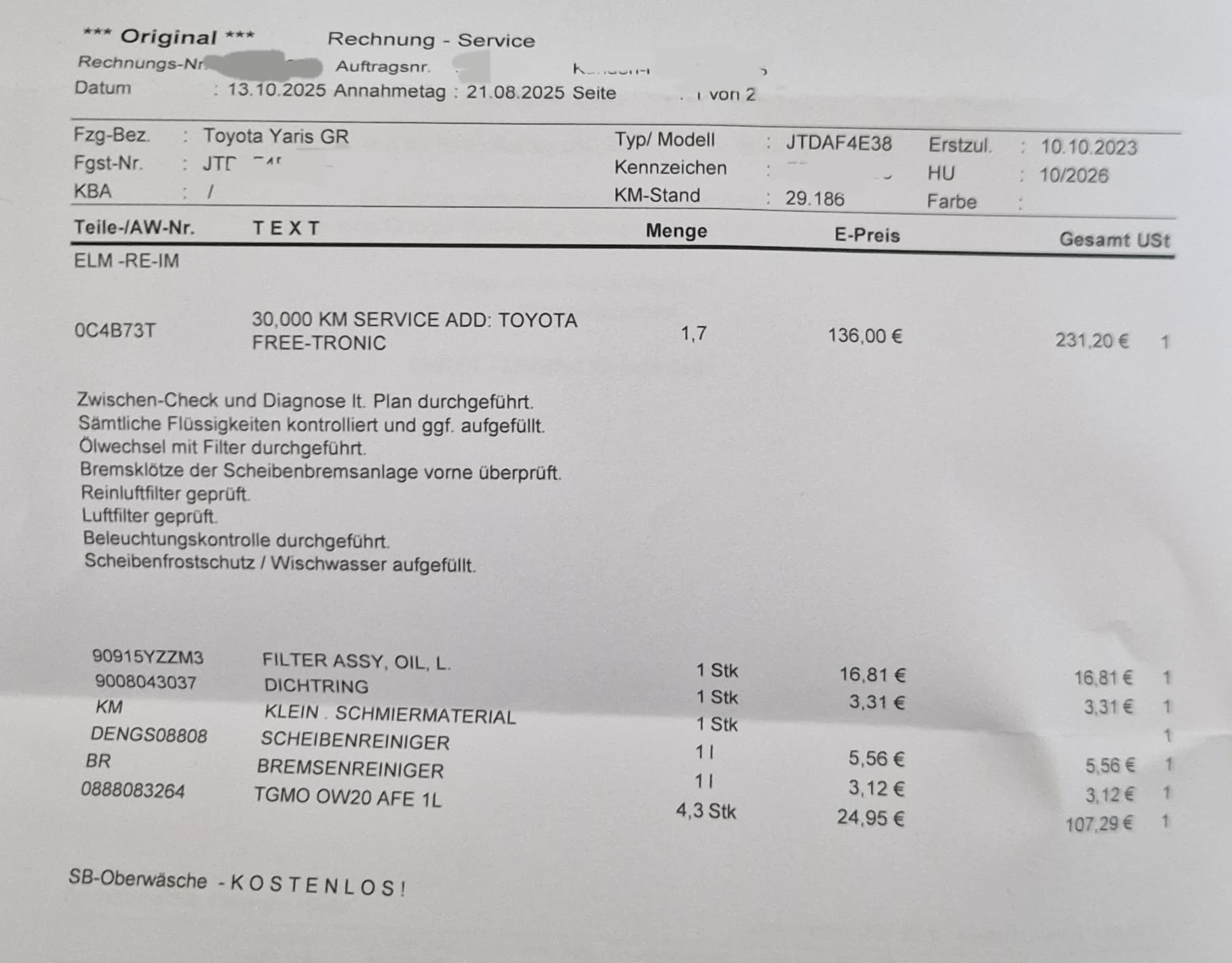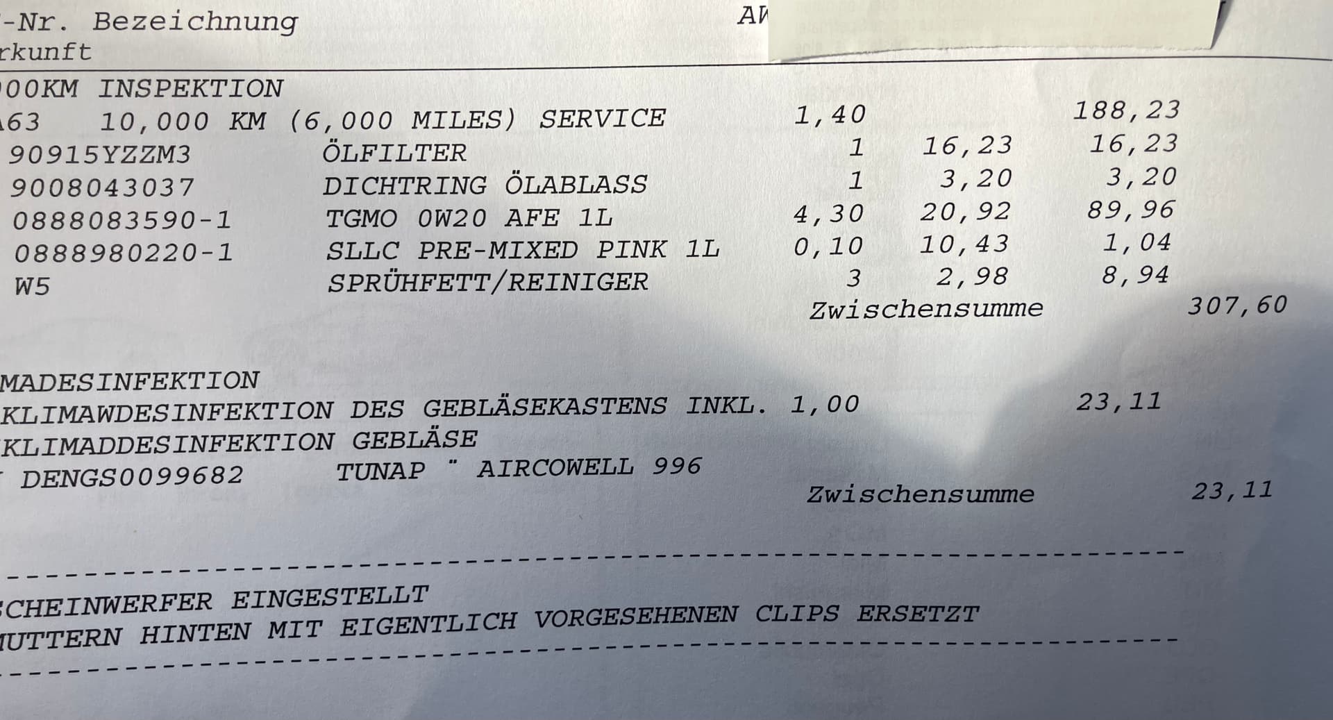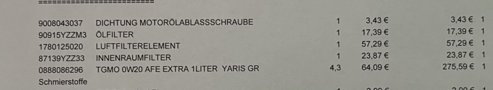 Ja, der Literpreis ist nicht korrekt. Bei Toyota kostet der Liter ca. 25,- netto. Sie haben dir wahrscheinlich das Öl für die Supra kalkuliert. Das ist anderes Öl und deutlich teurer. Sprich sie darauf an!