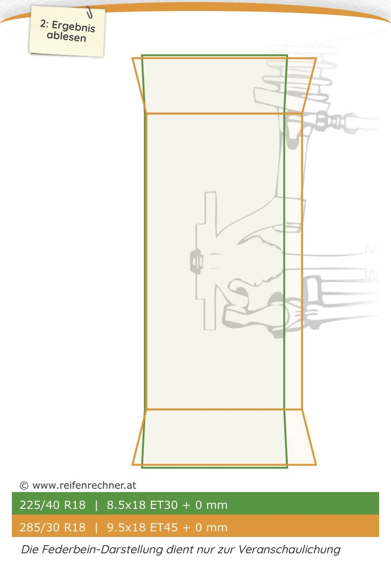 Passende 255 gibt es nicht, 245 wären möglich und 265 scheidet aus, da sonst eine Tachoangleichung nötig wäre, weil ich im Alltag und Winter 225er fahre, daher muss alles innerhalb der Toleranzen bleiben. das wäre mit den 285ern gegeben.